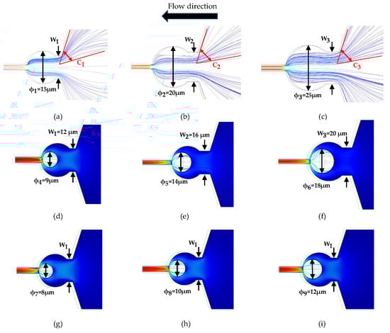 (a–c) Simulation of streamlines with different diameters ( = 15 μm, = 20 μm, and = 25 μm). (d–f) Simulation of different inlet widths ( = 12 μm, = 16 μm, and = 20 μm) for capturing microparticles of different diameters ( = 9 μm, = 14 μm, and = 18 μm). (g–i) Simulation of capture of microparticles of different diameters ( = 8 μm, = 10 μm, and = 12 μm) with same inlet width ( = 12 μm).
