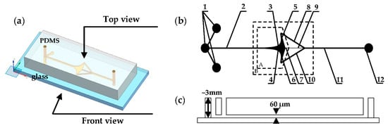 In Figure 5, The microfluidic chip utilized in this study is a polydimethylsiloxane and glass (PDMS–glass)-bonded chip, with a consistent channel height of 60 μm across all channels and the capture chamber. Upon selecting n = 2.5, the angle between the upper- and lower-line boundaries is determined to be 144°, as detailed in Equation (6). Given that most cells range between 8 and 12 μm in diameter, the inlet width (W) of the single-cell capture chamber is set at 50 μm, with a length (L) of 1 mm. To ensure stable capture, a capture circle with a diameter of 15 μm is designed at the stagnation point. The width of the resistance channel is specified as 5 μm. Additionally, the widths of the remaining channels are consistent with the inlet widths, all measuring 50 μm. The comprehensive set of parameters defining the chip is provided in Table 1.