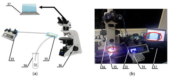 (a) The experimental schematic diagram of the microfluidic system. (b) The experimental platform construction diagram. The detailed description of the system is as follows: 13—fluid drive systems with cell suspension, 14—waste, 15—microfluidic chips, 16—imaging microscopes, 17—computer display systems.
