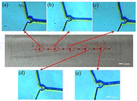 Figure 8a–e depict the single-cell capture diagram of an array microfluidic chip comprising five units interconnected at the beginning and end. Experiments were conducted directly at an injection rate of 120 μL/min, resulting in cell capture at all five capture ports. Notably, the sizes of the captured cells varied across the ports, with the cell at the third capture port (Figure 8c) measuring approximately 8 μm, while the cell at the fifth capture port (Figure 8e) was approximately 12 μm. The observation of the captured cells reveals noteworthy distinctions. For instance, the first capture port of the array chip (Figure 8a) displays significant cell deformation attributable to the high flow velocity, with cells being nearly squeezed into the resistance channel. Conversely, the final capture port (Figure 8e) exhibits a lower flow rate, resulting in cells with normal morphology.