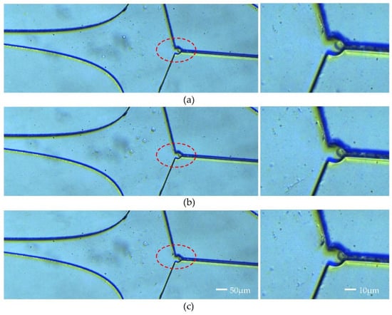 After capturing a single SIHA cell, the inlet flow rate was incrementally raised from 60 μL/min to 120 μL/min. In Figure 9, the cell remained stable at the capture point, with the red-marked section being clearly discernible upon magnification. At an inlet flow rate of 60 μL/min, the captured cell exhibited normal morphology without fully contacting the capture wall (Figure 9a). Upon increasing the inlet flow rate to 80 μL/min, a slight deformation of the trapped cell was observed, with a small portion being pushed into the resistance channel (Figure 9b). Subsequently, at a flow rate of 120 μL/min, a significant deformation of the cells occurred due to elevated flow rate pressure; however, the cells remained intact (Figure 9c). By comparing the scenarios depicted in Figure 9, it was demonstrated that despite a substantial increase in flow rate, leading to a considerable perturbation of the flow field, the trapped cells remained stably positioned at the capture port.