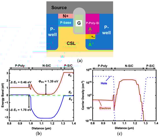 The energy band diagram of the P-Poly-Si/N-SiC heterojunction at thermal equilibrium is shown in Figure 2b. The energy band diagram at thermal equilibrium along the A-A’ cut-line is shown in Figure 2a. The heterojunction has a conduction energy gap of 0.46 eV and a valence barrier energy gap of 1.78 eV. The electron barrier height ΦBN is determined by the Fermi level energy Ef and the conduction band peak energy Ec, which is about 1.39 eV. Figure 2c shows the simulated carrier density at the heterojunction interface under forward bias at the rated voltage. Electrons are injected from N-SiC to P-poly, but there are few holes from P-poly to N-SiC due to the high hole barrier. Therefore, the HJD exhibits unipolar action, similar to the SBD [30].