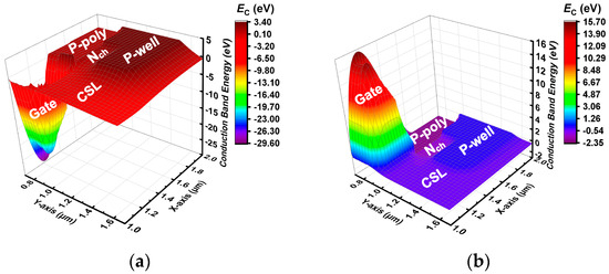 Figure 3. Three-dimensional conduction band energy distribution between P-poly, gate, Nch, N-CSL, and P-well (a) when conduction is forward and (b) when conduction is reverse.
