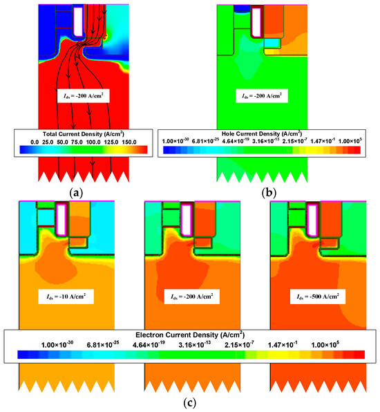 Figure 4. (a) Total current density distribution, (b) hole current density distribution, and (c) electron current density distribution at low and high current in the reverse conduction.