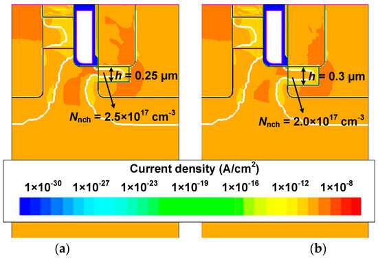 Figure 8. Current density distribution when (a) Nnch is 2.5 × 1017 cm−3, h is 0.25 μm, and (b) Nnch is 2.0 × 1017 cm−3, h is 0.30 μm at Vds = 0 V.