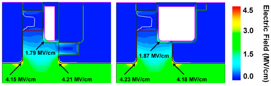 Figure 4 shows the distribution of the total current density, hole current density, and electron current density of the device. From the total current density distribution, it can be seen that the current does not flow from P-Poly-Si to P-well. But a high current density is also noted at the gate corner of P-Poly-Si, which should be noted in use. From the hole current density distribution, it can be seen that holes do not enter N-drift. This is due to the difference in the band gap between SiC and polysilicon. Since the energy barrier height between the SiC and polysilicon junctions in the valence band is very large, in the HJD-ATMOS, electron current can move toward the source while hole current cannot move toward the drain [31]. The device can operate normally at electron current densities of 10 A/cm2 and 500 A/cm2.