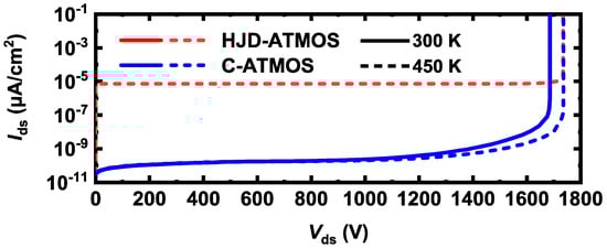 Figure 11 shows the electric field distribution at the breakdown of HJD-ATMOS and C-ATMOS. The electric field at the gate oxide of HJD-ATMOS is smaller than that of C-ATMOS. This is because the presence of the Nch introduces a portion of the electric field into this region, which alleviates the electric field that the gate oxide withstands. Although increasing the electric field at the heterojunction raises leakage current risk, it is a trade-off for improved reverse conduction performance. Figure 12 shows the blocking characteristics of the HJD-ATMOS and the C-ATMOS at room temperature and high temperature. At room temperature, the data are represented by solid lines, whereas at elevated temperatures, they are depicted by dashed lines. HJD-ATMOS and C-ATMOS have similar breakdown voltages at room temperature. But the leakage current of the HJD-ATMOS increases at high temperature due to the increased thermal energy of the charge carriers. The generation of leakage currents, as demonstrated and discussed in Figure 6 and Figure 8, arises due to leakage occurring at the heterojunction, where higher Nnch and greater values of thickness h both contribute to this effect. By improving the semiconductor material growth process, reducing defects and traps, and enhancing the material quality and interface integrity, it is possible to mitigate non-ideal scattering and trap effects experienced by charge carriers at the heterojunction interface, thus suppressing the leakage current. As discussed in reference [20,35,36], regarding leakage current, while the HJD-ATMOS structure does indeed experience leakage under temperature influence, this leakage is within acceptable limits, with the level of leakage current being 1 × 10−5 μA/cm2.