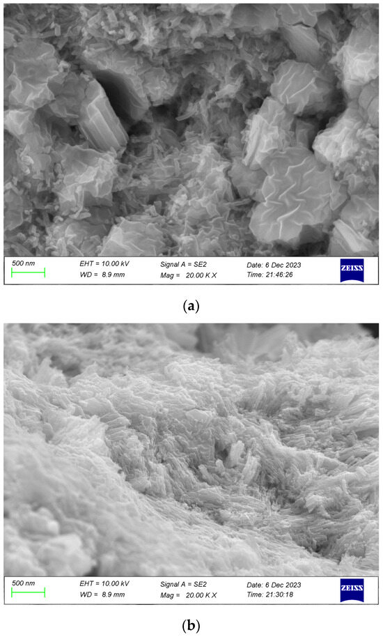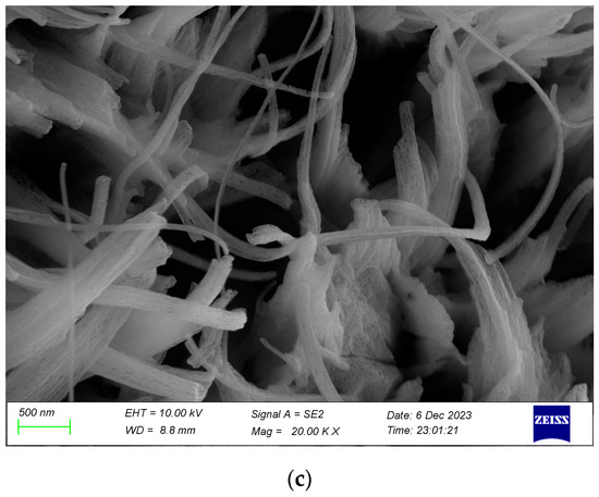 The SEM images in Figure 4 illustrate the varied morphologies of copper-based azide observed through scanning electron microscopy, with Figure 4a–c corresponding to Samples 1–3, denoted as Samples a, b and c, respectively. The distinct morphologies of the reaction products are attributed to the differing particle sizes of the precursors. The gas–solid reaction between the nanoporous copper precursors and HN3 gas progressed through stages of product island formation, product layer growth and solid-phase diffusion, along with Ostwald ripening processes [19]. Initially, the gas–solid reaction was initiated on the reactant surface, leading to the gradual formation of needle-like or rod-shaped product islands. These islands exhibited directional growth, resulting in an increased aspect ratio. Subsequently, a continuous product layer developed on the reactant surface, representing a material transfer process primarily occurring within a single nanoporous copper precursor. As the product layer thickened, the gas–solid reaction rate diminished and thermodynamic equilibrium drove Ostwald ripening. This process involves individual products coming into contact, facilitating solid-phase material transfer and increasing contact area while decreasing the aspect ratio of the reaction products, ultimately yielding a dense and smooth surface. The experimental findings highlight how precursor particle size influences final product morphology, with varying degrees of Ostwald ripening based on precursor particle sizes. For instance, Sample a corresponds to a nanoporous copper precursor with a particle size of approximately 100 nm, impeding HN3 gas diffusion channels early in the maturation process due to material expansion, resulting in a lower degree of maturation. In contrast, the nanoporous copper precursor in Sample c, with a particle size of around 30 nm, experienced rapid consumption during ripening, leading to a lower degree of ripening and prominent needle-like product shapes with reduced product density. Sample b corresponds to a precursor particle size of about 60 nm, which will neither block the diffusion channel of HN3 nor show precursor insufficiency during a reaction. This ensures a higher degree of Ostwald maturation, a dense and smooth surface of the reaction product and a higher product density.