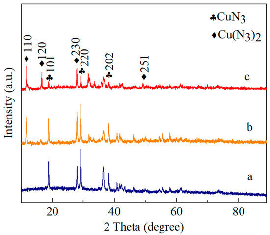 The composition analysis of the copper-based azide was conducted using an X-ray diffractometer, where La Kα rays were utilized within a scanning range of 10° to 90°. The results presented in Figure 5 reveal that the copper azide primarily consisted of CuN3 and Cu(N3)2. The test results indicate that in Sample a, the diffraction peaks were mainly attributed to CuN3, with no apparent diffraction peaks of Cu(N3)2 observed. In Samples b and c, in addition to CuN3, distinct diffraction peaks corresponding to the (110) and (230) crystal planes of Cu(N3)2 were also present. In Sample c, noticeable diffraction peaks for the (120) crystal plane of Cu(N3)2 were also observed. Alongside the CuN3 and Cu(N3)2, two distinct diffraction peaks were observed at 31.58° and 32.1°. Since copper-based azides are very sensitive, they need to be wetted with water in advance in order to prevent accidental explosion of the copper-based azide during sample preparation and testing; therefore, these peaks may correspond to the hydrolysis products of the copper-based azide. XRD examinations further indicated that the proportion of Cu(N3)2 in the reaction product increased as the precursor particle size diminished. This suggests that by manipulating the precursor particle size, one can influence the depth of the reaction and regulate the composition of the reaction product. Such control over composition can subsequently govern the output performance of micro-initiators.