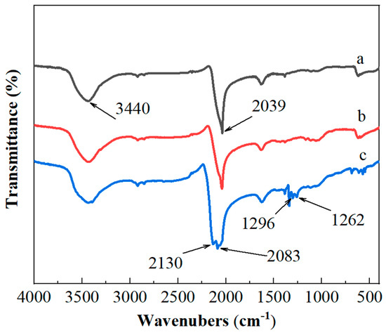 The infrared scanning of the reaction products was performed using the KBr pellet method, and the results are shown in Figure 6. The scanning range was set from 4000 to 400 cm−1. At 3440 cm−1, there is a stretching vibration peak corresponding to the hydroxyl groups. Due to the material’s sensitivity, the sample was moistened during preparation, resulting in water content in the sample. The peak at 2039 cm−1 is a characteristic infrared peak of N3−1. The peaks located at 2083 cm−1 and 2130 cm−1 represent the asymmetric vibration of N3−1, while the peaks at 1262 cm−1 and 1296 cm−1 correspond to the symmetric vibration of N3−1. These observations indicate the formation of copper-based azide through the reaction.