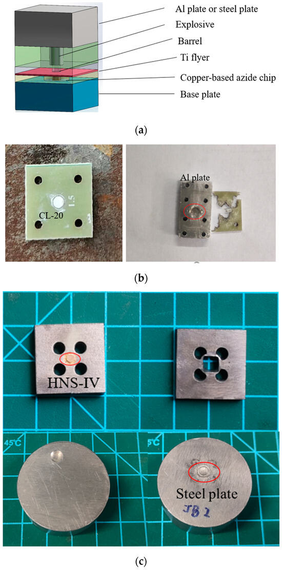 Figure 7. (a) Schematic illustration of the micro-initiator device, (b) initiation of CL-20 explosives and (c) initiation of HNS-IV explosives.