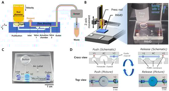 Schematic of the experimental setup and working principle of PAMD. (A) 2D schematic of PAMD connected with a sensor. The PAMD was activated via the customized press machine according to its designated parameters. (B) 3D schematic of the customized press control machine equipped with a press rod and a PAMD, and an actual image of the press rod and the PAMD. (C) An actual image of the PAMD filled with erioglaucine solution for visualization. The default length of the microchannel (L) was measured from V2 to outlet. (D) Actuation principle of the PDMS membrane in the PAMD.
