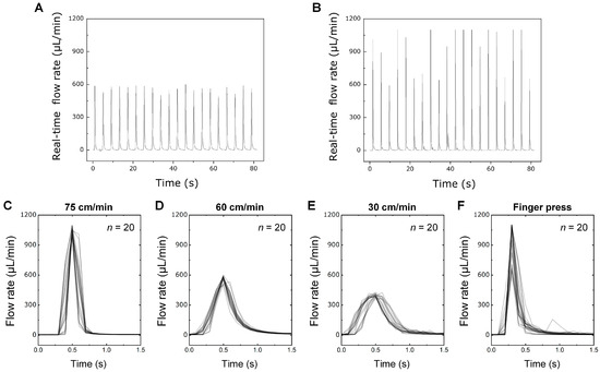 Evaluation of the customized press control machine and its performance comparison with human finger press. (A) Reproducibility of a flow rate using a customized press machine and (B) human finger press. Overlapped flow profiles of the PAMD using the press machine under the pressing velocity of (C) 75, (D) 60, (E) 30 cm/min, and (F) those using human finger press.