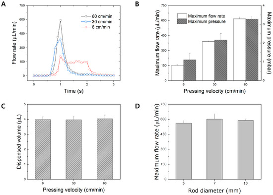 Evaluation of flow behavior based on pressing velocity and rod diameter. (A) A general flow rate profile based on various pressing velocities. (B) A correlation of pressing velocity with maximum flow rate and pressure. (C) A graph of the dispensed volume under various pressing velocities. (D) A graph of the average maximum flow rate versus rod diameter.