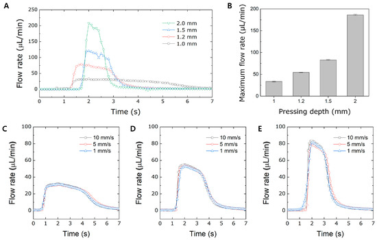 Since pressing depth also affects the degree of air compression of the pneumatic channel, the evaluation of the flow rate under various pressing depths was conducted using a press control machine. The pressing depth was elaborately controlled by the press control machine by setting the z-axis movement from 1.0 mm to 2.0 mm. When the pressing depth is deeper than 1.2 mm, the degree of air compression is sufficient, resulting in a sharp increase and decrease in the flow rate, as shown in Figure 5A. However, when the pressing depth becomes lower than 1.2 mm, the degree of compressed air also decreases, affecting the PDMS membrane deflection. When the degree of compressed air decreases, the rate of PDMS membrane deflection becomes slower and more consistent. The fluid flow continued for several seconds when the pressing depth was as low as 1.0 mm. In addition, the lower the pressing depth, the lower the maximum flow rate due to the slower deflection of the PDMS membrane of the actuation chamber. Under the same pressing velocity, the flow profile highly depends on the pressing depth.