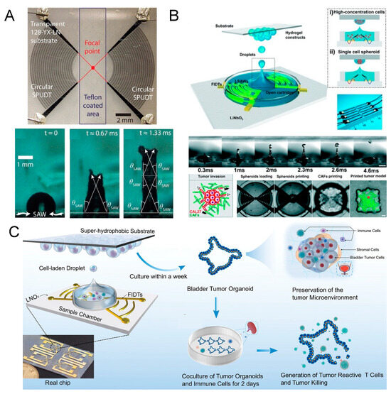 The surface acoustic wave-powered acoustofluidic droplet printing technique is an increasingly popular technique used to promote fluid–substrate interaction and realize three-dimensional spatial translocation of micro-droplets [146,147,148]. The most common concept is to use focused interdigital transducers (FIDTs) to transfer mechanical energy into a liquid and produce a jet to create tiny droplets [149,150]. Basically, two identical leaky surface acoustic waves (LSAWs) are released from opposing FIDTs and interfere with each other. Eventually, an intense acoustic pressure profile is formed at the geometrical focus to levitate the liquid–air interface above the acoustic energy’s focus [151]. When the mechanical vibration strength is strong enough to break the surface tension, the liquid above is deformed into elongated liquid columns (Figure 6A). Finally, tiny droplets are dispensed into the air [152]. Compared with the traditional water-in-oil droplet manufacturing method that uses the oil phase to shear the water phase, the acoustofluidic droplet printing technique gets rid of the limitations of the physical device channel and can directly create water-in-air droplets in an oil-free manner [153]. Without the conventional and complex oil–water separation operations, the droplets can be isolated and collected directly for subsequent applications. Further, the technique possesses the ability to precisely control the spatial position of a single droplet, unmatched by the resolution of traditional 3D bioprinting. Combined with a suitable hydrogel matrix, this technology is particularly suitable for constructing complex micro-physiological environments for in vitro tissue engineering research [154,155,156,157,158,159]. Chen et al. presented a functional tumor microenvironment constructed by the acoustofluidic droplet printing technique in 2021 (Figure 6B) [160]. They first demonstrated that a droplet array with a specific geometry can be generated on demand with the technique. Then, both the single-cell-laden droplet and single-cell spheroid-laden droplet printing processes were manifested. As a complete product display, the research group embedded a tumor spheroid right in the center of a single cancer-associated fibroblast (CAF)-rich microenvironment. They claimed that this advanced acoustofluidic bioprinting technique features high precision while maintaining low cell damage characteristics and is believed to support other in vitro disease model constructions. Soon after, Gong et al. reported tumor organoid formation through the same technique, proving that the technique can really deal with clinical samples (Figure 6C) [161]. Large-scale patient-derived bladder tumor organoids mimicking the in vivo immune microenvironment were produced within one week as part of an in vitro model to screen a potential personalized tumor immunotherapy. All these works testify that the technology can be used as a practical alternative to overcome the limitations of conventional 3D bioprinting technology when targeting microscopic models for in vitro investigation.