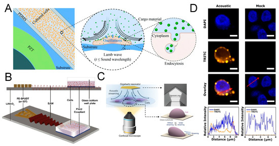 Acoustofluidic intracellular delivery into live cells. (A). An acoustofluidic device to generate acoustic streaming, enhancing the intracellular delivery of cargo into adherent cells. Reprinted with permission from [174]. (B). A SAW-based transfection platform to generate high-frequency acoustic excitation and enhance the uptake of RNA into nonadherent cells. Reprinted with permission from [175]. (C). A gigahertz ultrasonic device to induce controllable cells and, thus, adjust cellular membrane permeability. Reprinted with permission from [176]. (D). Confocal scanning results showing the fluorescence signal of delivered DNA material in cells with/without acoustofluidic sonoporation. The fluorescence intensity is profiled across the red arrows direction. Reprinted with permission from [177].