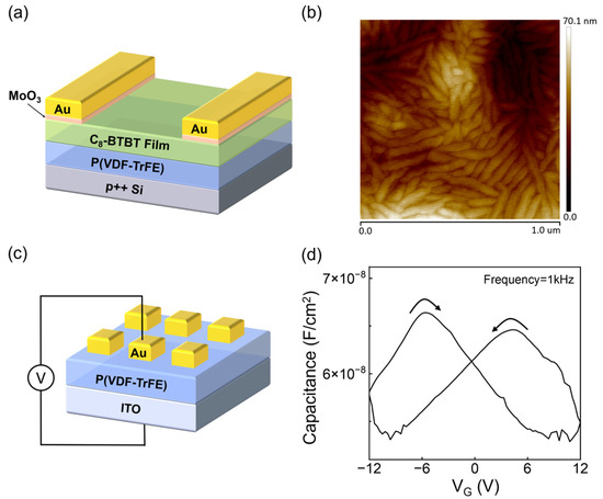 Experimental OFe-FET devices with P(VDF-TrFE) (Sigma-Aldrich, Saint Louis, MO, USA) as the ferroelectric materials, C8-BTBT as the semiconductors, silicon substrate as the gate electrode and MoO3/Au (5 nm/60 nm) as the drain and source electrodes are shown in Figure 1a. P(VDF-TrFE) films were deposited on the heavily p-doped silicon substrate by spin coating using a solution of 50 mg/mL P(VDF-TrFE) 70/30 mol% dissolved in dimethylformamide (DMF), which was followed by drying and annealing at 135 °C for 2 h in N2 atmosphere. The C8-BTBT layer was then thermally evaporated with a thickness of 40 nm. Finally, MoO3 and Au (5/50 nm) were deposited by thermal evaporation to define the source and drain electrodes. The capacitance of the ferroelectric layer was measured by applying the AC voltage (frequency = 1 kHz) on the capacitor using a Precision LCR Meter E4980A (Agilent Technologies Inc., Santa Clara, CA, USA). The transfer characteristics of the OFe-FETs were measured using a semiconductor analyzer (B1500A, Agilent Technologies Inc., Santa Clara, CA, USA).