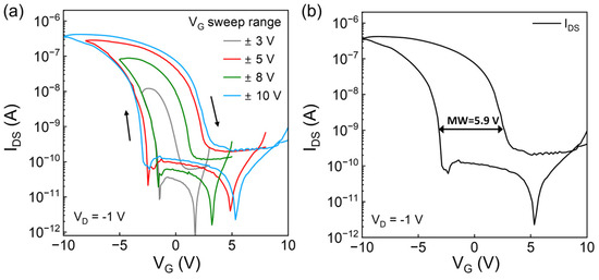 (a) Transfer characteristics measured at different VG sweeping ranges (VD = −1 V, the sweep direction has been denoted by arrows). (b) Schematic of the memory window when VG sweeps from 10 to −10 V and then backward.