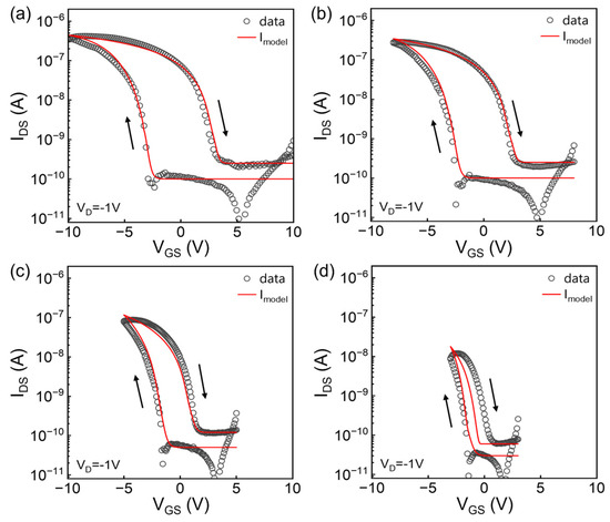 (a–d) Fitting results of quasi-static transfer curves at different VG sweeping ranges (symbols represent experimental data and red lines represent the calculated values, the sweep direction has been denoted by arrows).