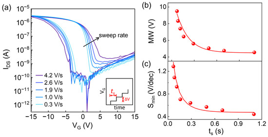 The influence of voltage sweeping rate on the dynamic transfer characteristics is investigated. The sweeping rate (s) can be calculated as s = ΔV/ts, where ΔV is the increment of VG, and ts is the measurement time for each VG step (as shown in the inset of Figure 5a). Using VG with different periods ts, in Figure 5a, the device memory window (MW) increased and the minimum of subthreshold swing (Smin) decreased as the sweeping rate increased. According to the equivalent circuit of the device (Figure 3b), the voltage division relationship and charge conservation equation can be written as: