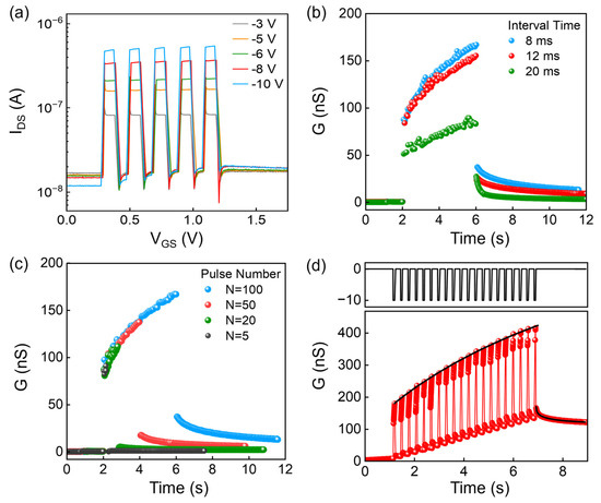 Negative pulses with fixed pulse numbers (N = 5) and different amplitudes were first input (the amplitude of these pulses are −3 V, −5 V, −6 V, −8 V, and −10 V, respectively; see Figure 6a). The response current increases from 83 to 542 nA as the pulse amplitude increases from −3 to −10 V, confirming that higher pulse amplitude results in a wider variation of EPSC. This phenomenon can be explained by the model above. With the large input voltage, the Emax in Equations (1) and (2) increases and induces a more complete polarization switching (P), which leads to the enhanced conductance. Figure 6b shows the conductance response to pulse inputs with a fixed pulse number (N = 100) and different interval times (8, 12 and 20 ms). A shorter interval time resulted in the larger range of variation of the channel conductance (G). For example, G varies between 51 and 84 nS in response to the pulses with an interval time of 20 ms, and it varies between 83 and 167 nS in response to the pulses with an interval time of 8 ms. The high conductance state under pulse input with short interval time also resulted in a longer time to return to the initial state, which is similar to the forgetting process of brain memory. In terms of pulse number (N), pulses with a fixed amplitude (−4 V), a fixed interval time (12 ms) and different pulse number were input (the pulse number of these pulses are 5, 20, 50 and 100). Figure 6c shows that when the pulse number N is 5 (or 100), the conductance increased reaches 86 (or 167 nS) and returns to 1 nS (or 37 nS) immediately after the inputs. Based on these results, we applied a pulse sequence with an amplitude of −10 V (N = 20) to obtain the essential synaptic function: long-term potentiation (LTP) as shown in Figure 6d. The conductance maintains at 122 nS even after the pulse inputs are removed for a period of time.