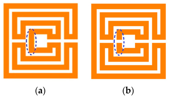 For a specific type of Matryoshka geometry, there are two sub-types: the open and the closed. It is open when there is a gap in the smaller inner ring (Figure 3). As is detailed in the next sections, this gap has a remarkable effect on the structure’s characteristics, namely, on its resonance frequencies. Due to the metal continuity, in the closed configuration, for the first resonance