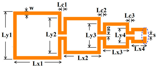 The name Matryoshka comes from the well-known Russian dolls, shown in Figure 1, that are successively nested inside each other. It has been used to refer to nested sets in many areas of electrical and electronics engineering, such as electronics packaging [1], implantable medical devices [2], biomedical imaging [3], computer network security [4], silicon compounds [5], software protection [6], Internet-of-Things [7], image retrieval [8] and reconstruction [9], cancer gene analysis [10], cellular biophysics [11], cloud computing [12], 5G network slicing [13], acoustic wave resonators [14], pattern recognition [15], and astronomy [16]. It has also been used associated with planar printed configurations. This combination of printed circuits with Matryoshka-like geometries benefits from the well-known advantages of printed planar technology (low profile, lightweight, compactness, low cost, easy fabrication and integration of electronic components, wide range of characteristic impedances) and the multiband (or wideband) behavior and miniaturization associated with Matryoshka configurations. The Matryoshka-like scheme was used for the first time in planar printed circuit structures at the Group of Telecommunications and Applied Electromagnetism (GTEMA) from the Instituto Federal da Paraíba in João Pessoa, Brazil. A multi-resonant frequency selective surface (FSS) was proposed in 2014 [17,18]. Since then, the work in these planar printed structures based on Matryoshka geometries has progressed steadily at GTEMA, as reported in many MSc theses [17,19,20,21,22,23,24,25,26,27,28,29,30,31] and associated publications [32,33,34,35,36,37,38,39,40,41,42,43,44,45,46]. Different applications have been envisaged, such as FSSs [17,18,19,21,23,24,27,32,33,36,38,39,40,42], filters [20,22,26,30,37,43,46], antennas [25,28], and sensors [29,31,34,35,41,44,45]. All these applications are motivated mainly by the huge importance of new telecommunication systems, particularly mobile communication networks, with emphasis on the recently deployed 5G systems and the closed associated Internet-of-Things (IoT). New ideas and perspectives are being explored to further develop these new types of structures. However, having been worked on for about ten years, the topic is already sufficiently mature to justify the publication of a review paper. Therefore, the goal of this paper was to precisely present a review on the work conducted in the field of planar printed structures based on Matryoshka geometries. The paper is organized into seven sections. After this introductory section, Section 2 deals with the printed planar Matryoshka geometry. The Matryoshka cell is described, and the corresponding working principles are analyzed. Section 3, Section 4, Section 5, and Section 6 are dedicated to the description of the use of this type of cell in FSSs, filters, antennas, and sensors in already-reported applications, respectively. At the end, Section 7 contains the main conclusions and the perspectives of present and future developments.