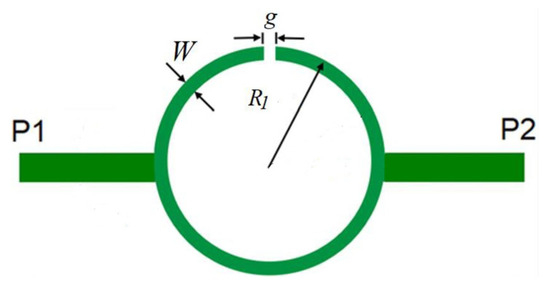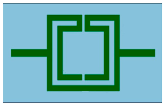The outline of a microstrip filter, with an open Matryoshka geometry of two rings, is shown in Figure 5. The input and output microstrip lines are 2.8 mm wide (50 Ohm characteristic impedance). W = 2.0 mm and g = s = 1.0 mm are used.