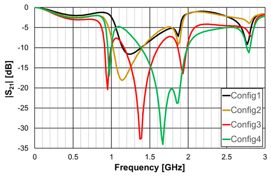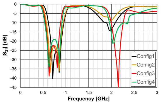 Comparison of the simulated |S21| results for configurations 1 and 2.