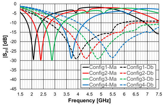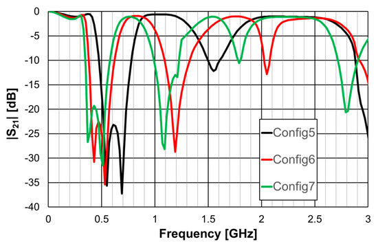 As can be concluded from Figure 6, the open configurations present adequate characteristics for a stopband filter, that is, high attenuation in the stopband, low attenuation in the passband, steep slope transition from passband to stopband (and vice-versa), and large bandwidth. However, that is not the case for the closed configurations (Figure 7). The open configuration provides a higher order filter because it offers two different resonance paths and the closed configurations just one. Moreover, as predicted, the open configurations have much lower first resonance frequencies. As is verified in the next sections, this conclusion was also obtained for the Matryoshka configurations used for other envisage applications (FSSs, antennas, sensors). Table 2 summarizes the characteristics of the open Matryoshka filter configurations.
