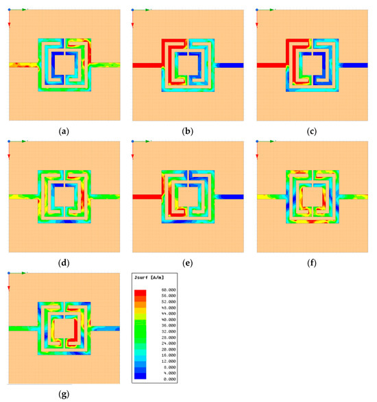 Simulated surface current density of the open Matryoshka filter with three rings (configuration 6). (a) f = 0.33 GHz, (b) f = fr1 = 0.43 GHz, (c) f = fr2 = 0.53 GHz, (d) f = 0.83 GHz, (e) f = fr3 = 1.19 GHz, (f) f = 1.79 GHz, (g) f = fr4 = 2.05 GHz.