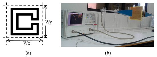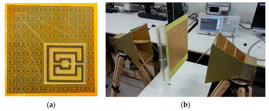 Closed Matryoshka FSS. (a) Unit-cell geometry. (b) Photo of the prototype with 10 × 10 unit-cells and measurement setup.