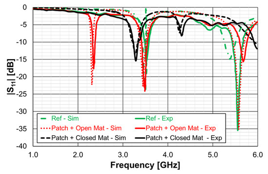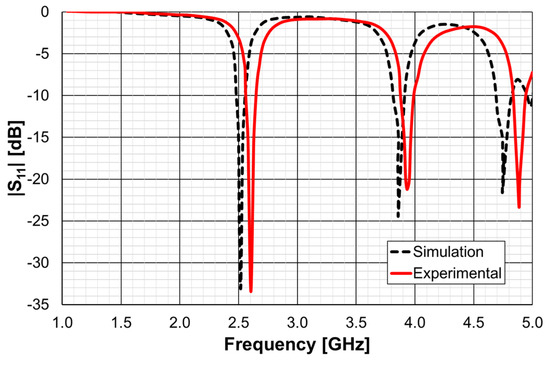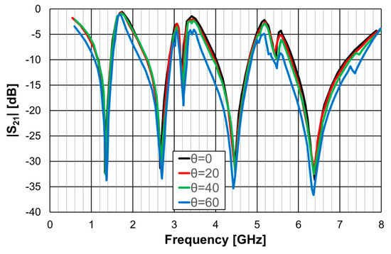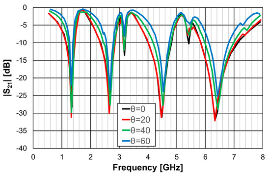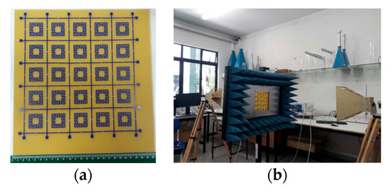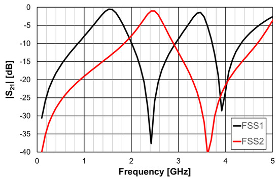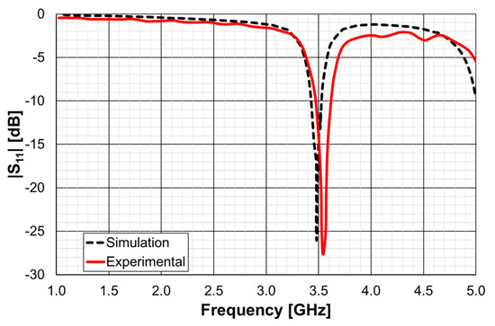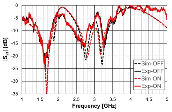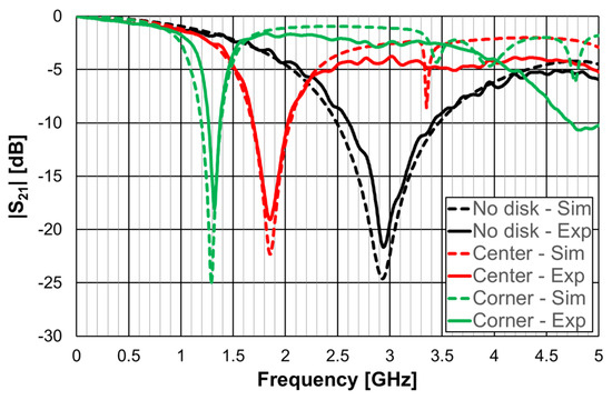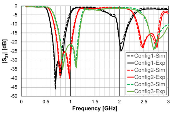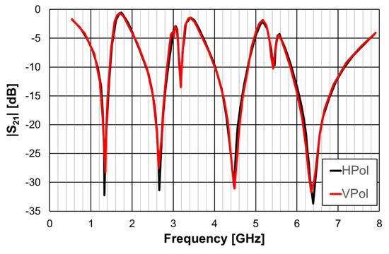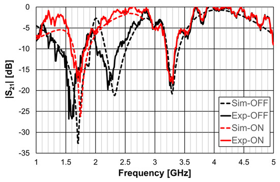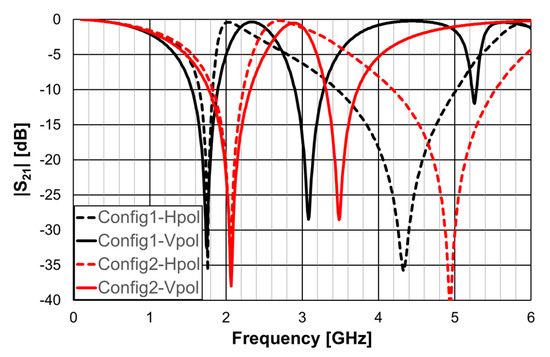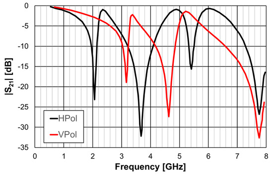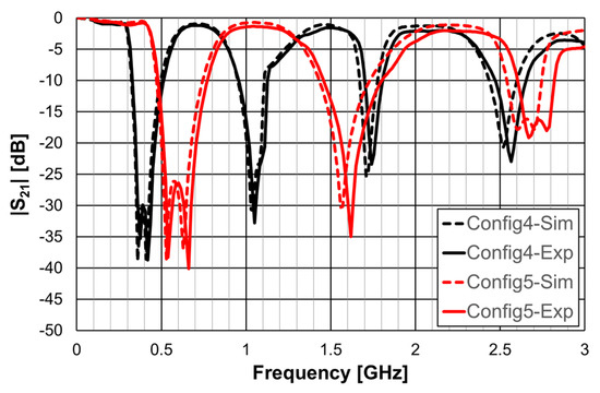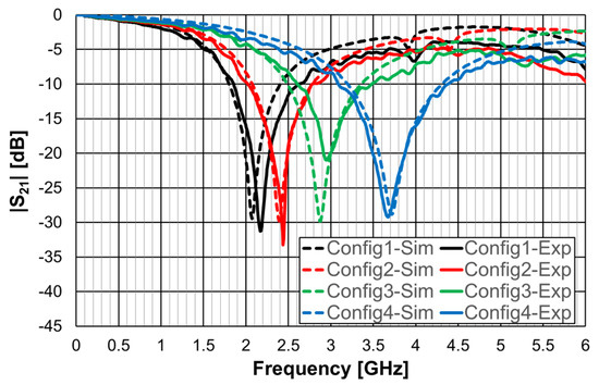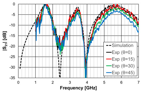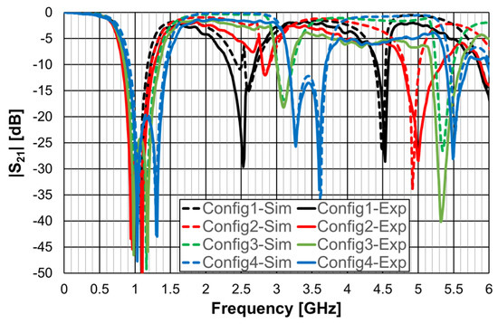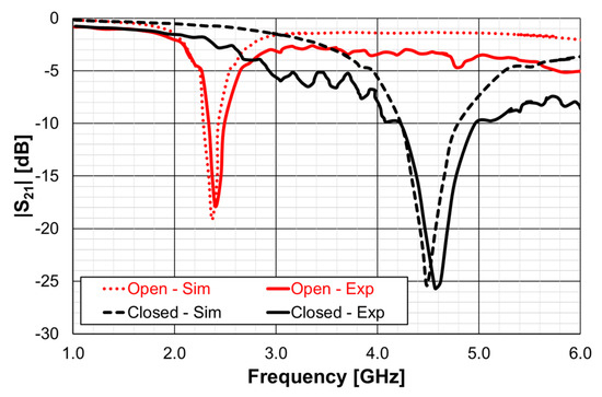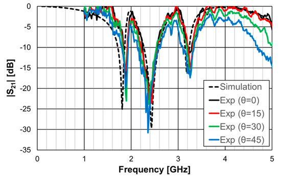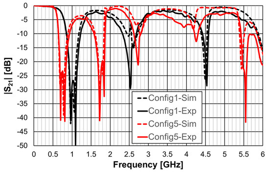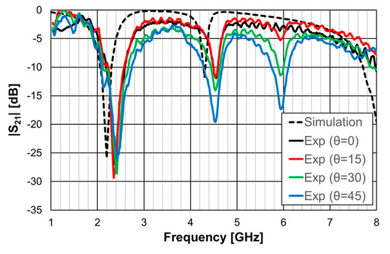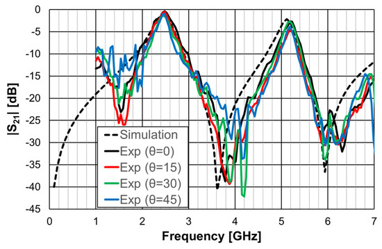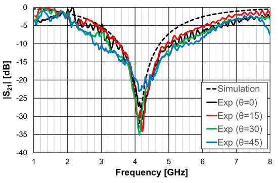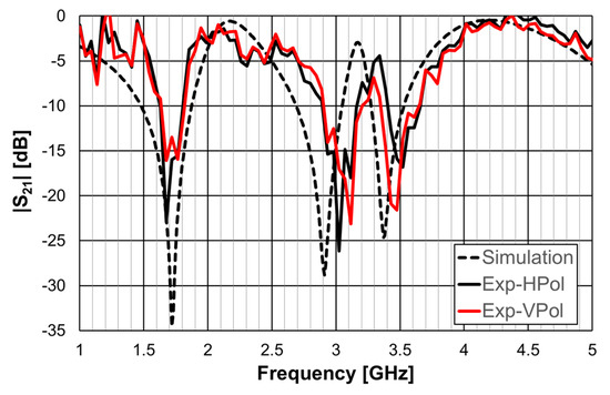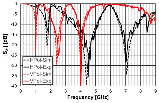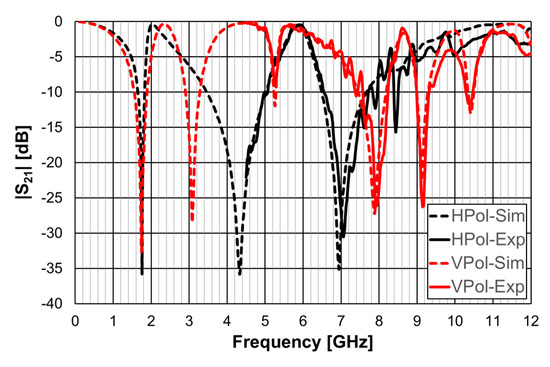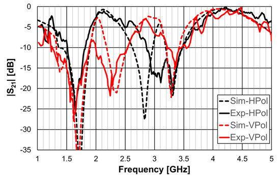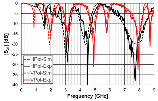 The simulation and experimental transmission coefficient results, obtained for configuration 1, are shown in Figure 11. The simulation results correspond to an infinite FSS (Floquet boundary conditions [51,52]). The horn antennas, available at the time, only allowed measurements above 4.5 GHz.