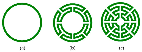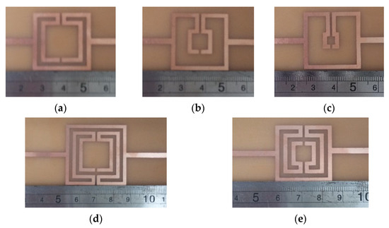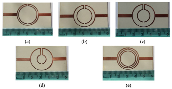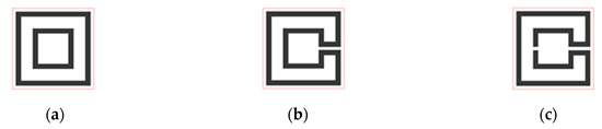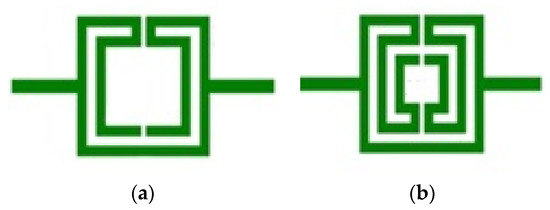 The Matryoshka geometry is based on concentric rings. As shown in Figure 2, Matryoshka geometries have been conceived as an evolution of the split ring resonators (rings). Starting with a set of rings (so far homothetic), a gap is introduced in each one and then the consecutive rings are connected near the gaps. However, differently from the SRR [47], the rings are connected. As in an SRR, the rings may take different shapes, from simple ones (as square or circular) to other, more complex, canonical or non-canonical geometries. Matryoshka geometries have been implemented in printed circuit board (PCB) technology, both with and without a ground plane. As the SRR, they can be formed by metal strips or by slots in the metal (complimentary configurations). As complimentary configurations, Matryoshka geometries have been used in defected ground structures (DGSs) [30,48] and FSSs [24].