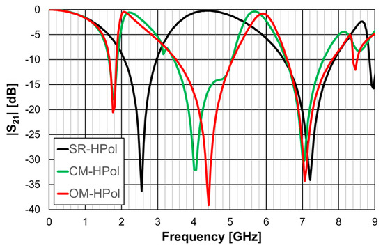 Simulated |S21| results of the simple rings (SR), closed Matryoshka (CM) and open Matryoshka (OM), for horizontal polarization (HPol).