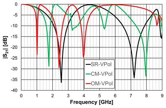 Simulated |S21| results of the simple rings (SR), closed Matryoshka (CM) and open Matryoshka (OM), for vertical polarization (VPol).