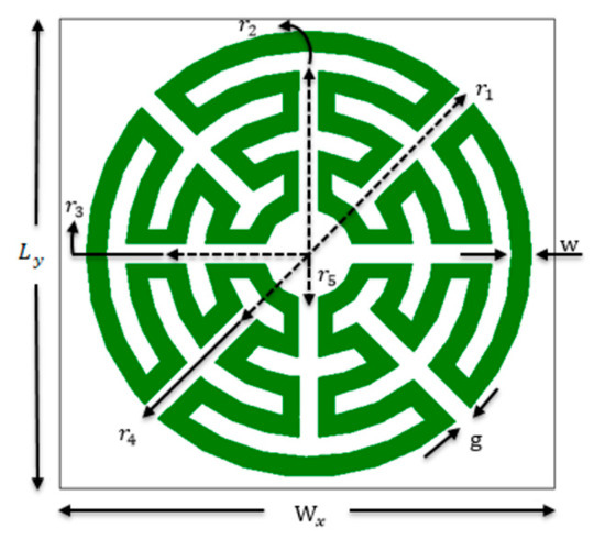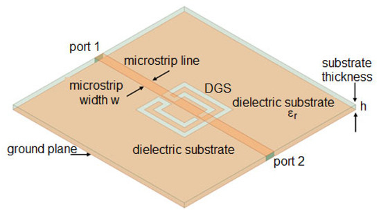 where λ0 is the wavelength in a vacuum. The procedure used to calculate εref depends on the type of configuration used, which is associated with the envisaged application. For filters, a microstrip structure has been used, whereas for FSSs, a simple substrate without a ground plane has been selected. For antenna applications, so far, only microstrip structures with DGSs have been employed.