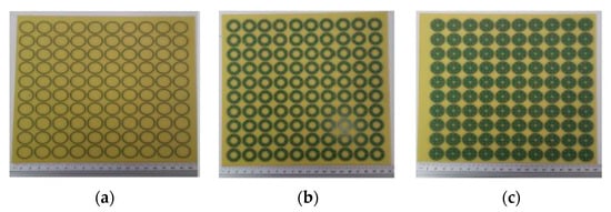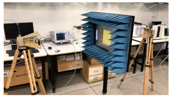 More rings can be used to increase the effective length and therefore further reduce the first resonance frequency, increase the number of resonances, and provide a fine-tuned control of the resonances and of the bandwidth [19,32]. To confirm these conclusions, an FSS with an open Matryoshka unit-cell with three rings was designed, fabricated, and tested. Again, a 0.97 mm thick FR4 substrate with εr = 4.4 and tanδ = 0.02 was used. A unit-cell with size Wx = Wy = 24.0 mm, L1 = 22.0 mm, Lc1 = Lc2 = 2.25 mm, L2 = 14.5 mm, L3 = 7.0 mm, w = 1.5 mm, and g = s = 1.0 mm was chosen. Photos of the prototype and of the experimental setup are shown in Figure 17.