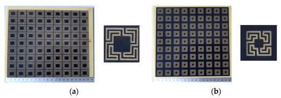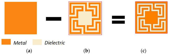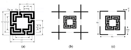 Using Equations (1), (4), and (5) and the procedure proposed in [17,18] to estimate Lef and εref, the initial dimensions of the Matryoshka unit-cell, fulfilling the specifications, can be obtained. Lef depends on the polarization considered. Usually the two orthogonal linear polarization (vertical-V and horizontal-H) are employed. The use of a numerical simulator can then provide the necessary optimization.