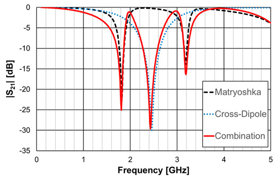 The first application suggested for the Matryoshka geometry was as FSS [17,18]. This is quite logical since, at the time, there was already a strong and continued research activity in the topic of FSS at GTEMA, and FSS was already widely used in microwave, millimeter wave, and Terahertz frequency bands. There are many specific applications of FSSs, such as RFID, absorbers, rasorbers, reconfigurable intelligent surfaces (RIS), RF energy harvesting, polarizers, dichroic sub-reflector and reflector antennas, reflectarray antennas, beam-switching antennas, lens antennas, and radio astronomy [51,52,53]. A very important initial choice in the design of an FSS is the geometry of the unit-cell. Despite the variety of available geometries, with the rapid growing of wireless technologies, telecommunication system requirements impose a continuing challenge to meet characteristics such as miniaturization, multiband operation, and polarization independence.