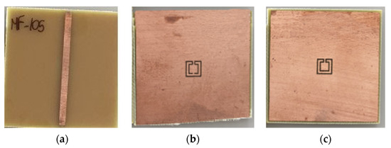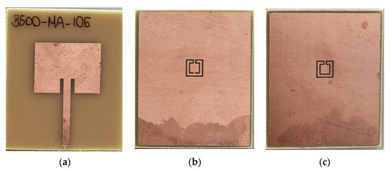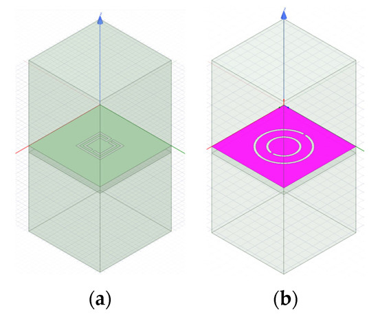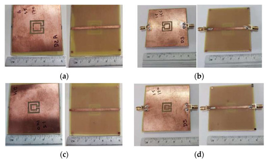 The four configurations, indicated in Table 1, were numerically simulated in Ansoft HFSS [50]. Square rings were used (Ln = Lxn = Lyn). All the four configurations had the same average perimeter (PN = 178.00 mm).