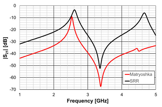 Microstrip filters based on open Matryoshka geometries with two, three, and four rings were also simulated. The corresponding dimensions are indicated in Table 3. The previously indicated FR4 substrate, w = 2.0 mm and g = s = 1.0 mm, were used, again.