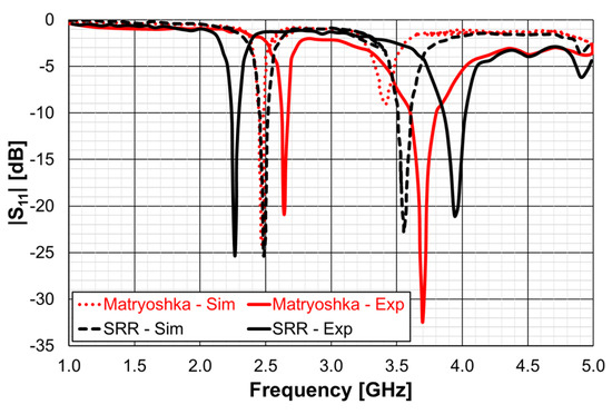 The simulation and experimental results of the three rings of open Matryoshka geometry for vertical and horizontal polarizations are shown in Figure 18. The experimental results were only able to be measured starting at 1 GHz. There was a general good agreement between the simulation and experimental results. As mentioned before, and as can be verified in Figure 17b, the ripple in the experimental results was caused by the reflections on the objects present in the non-anechoic environment of the laboratory.