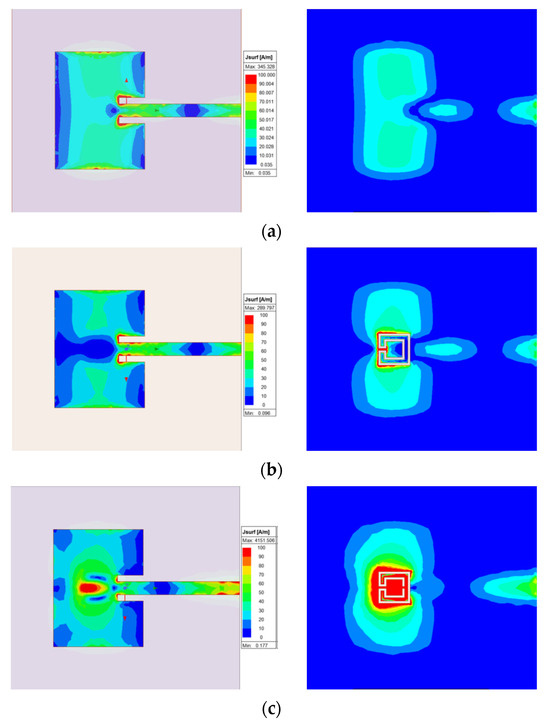 There was a common pattern of the surface current distribution at the resonance frequencies. Being a stopband filter, there was no transmission at the resonance frequencies. In fact, for such frequencies (Figure 9b,c,e,g), the current at the output port was negligible, and the current at the input port was very strong due to a positive interference of the incident wave and the waves reflected at the two parallel paths, mostly if there was a good input impedance matching. For the frequencies between resonance frequencies (Figure 9a,d,f), there was almost perfect transmission. It was also noticeable that the current magnitude on the inner rings increased as frequency went up.