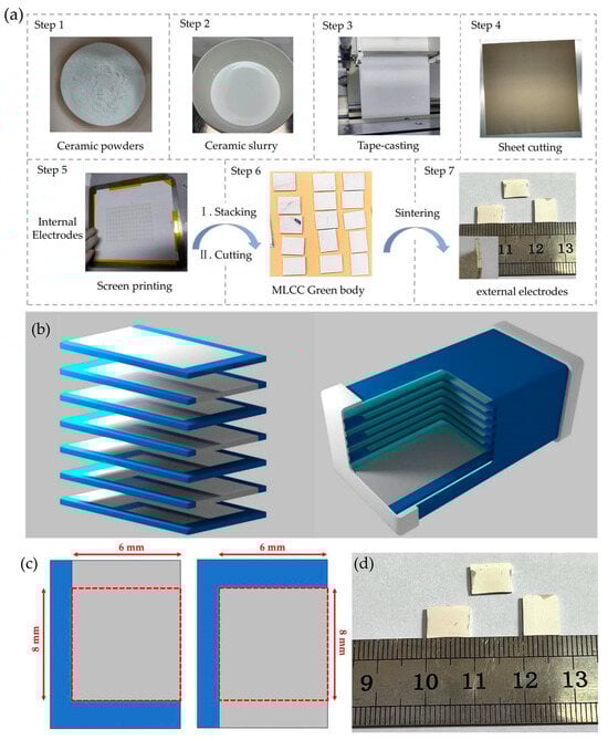 (a) The diagram illustrating the fabrication process of the MLCC. (b) Schematic diagram of the BST-MLCC structure. (c) Schematic diagram of the MLCC inner electrode. (d) The finished MLCC with an area of 10 mm × 6 mm.