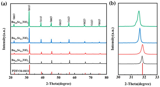 BaxSr1−xTiO3 ceramics, where 0.5 ≤ x ≤ 0.8, were calcined at 1200 °C for 4 h and they evinced a pure perovskite phase, as displayed in Figure 2a. As shown in Figure 2b, it can be observed that with the increase of x from 0.5 to 0.8, the main peak of the pre-sintered BaxSr1−xTiO3 powder shifts to the left at 31.6°.