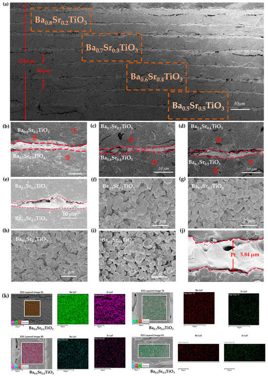 SEM image of the CGML capacitor prepared at 1020 °C (a), interface between layers (b–e), BaxSr1−xTiO3 (x = 0.8, x = 0.7, x = 0.6, 0.5) grains (f–i), metal platinum internal electrode (j). (k) SEM/EDS of dielectric layers with different compositions.
