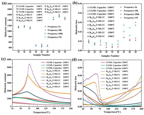The dielectric constant of the BST-MLCC sintered at 1300 °C, 1250 °C, and 1200 °C, varied with the measurement frequency, as shown in Figure 4a. The dielectric constant of the CGML capacitor is approximately 1200, surpassing that of the BST (0.5/0.5)-MLCC (~500), and the difference is relatively small compared to the BST (0.8/0.2)-MLCC with the highest dielectric constant (~1550). This may be attributed to the fact that the Curie temperature of the CGML capacitors is closer to room temperature compared to the BST (0.5/0.5)-MLCC. Along with the rise in frequency, the dielectric constant of the CGML capacitors experiences a slight decrease, while other samples vary significantly. This evidence suggests that ceramic capacitors fabricated using the CGML structure do not manifest a conspicuous decline in their frequency stability.