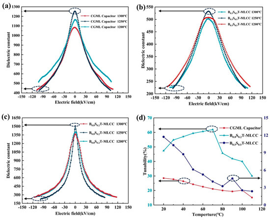 Variation in value of a CGML capacitor (a), BST (0.5/0.5)-MLCC (b), and BST (0.8/0.2)-MLCC (c) with respect to the applied electric field at 100 kHz and tunability at 10 kV/cm with respect to the temperature of the BST-MLCC sintered at 1250 °C (d).
